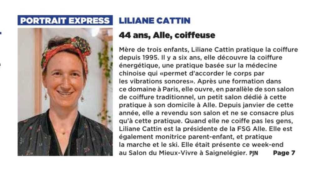 Très bel article du Quotidien Jurassien du 15 avril 2024 Publié parintuition1915 avril 2024Publié dansNon classé Similaire Publié par intuition19 Je suis coiffeuse diplômée depuis 1998, puis j'ai obtenu mon certificat de coupe énergétique en 2018. Voir plus d’articles